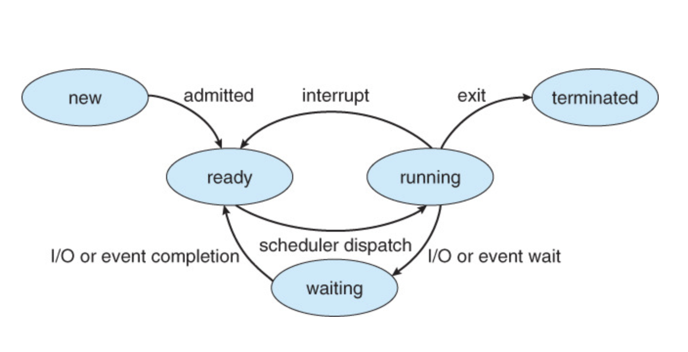 - 프로세스 상태: new, ready, running, waiting, terminated