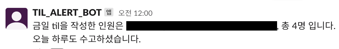 "금일 til을 작성한 인원은 aaa, bbb, ccc, 총 3명 입니다.