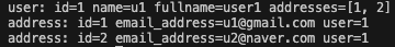 print(f"user: id={u1.id} name={u1.name} fullname={u1.fullname} addresses={[address.id for address in u1.addresses]}")