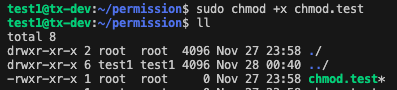먼저 문자 코드를 사용하여 권한을 변경하였다. chmod 뒤에 +x 을 mode 값으로 입력하여서 chmod.test 의 모든 섹션에 실행 권한을 주었다.