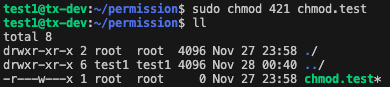 그 다음으로 숫자 코드를 사용하여 권한을 변경하였다. 421 을 mode 값으로 입력하여서 chmod.test 파일의 권한을 변경하였다. 그 결과 사용자는 읽기 (4), 그룹은 쓰기 (2), 그 외 사용자는 실행 (1) 권한을 허용하도록 변경되었다.