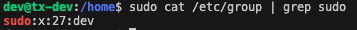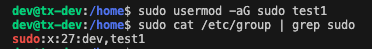 현재는 sudo 그룹에 dev 계정만 추가되어 있는 것을 확인할 수 있다. 여기서 사용자를 추가하기 위해서는 "usermod" 명령어를 사용한다.