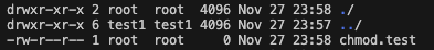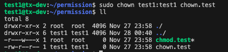 사진은 chown.test 의 소유권을 test1:test1 으로 변경한 결과이다. 이를 통해서 소유권을 root 계정에서 test1 계정으로 변경하였다.