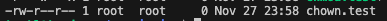 chown.test 파일의 정보를 보면 파일의 접근권한 정보 다음에 "root root" 라는 정보가 출력된다. 이 정보가 chown.tset 의 소유권 정보인데 첫번째 root 가 소유자, 두번째 root 가 그룹을 의미한다. 그렇기 때문에 root 그룹의 멤버와 그 외의 사용자는 해당 파일의 읽기만 가능하고 root 계졍은 읽기와 쓰기가 허용된다.