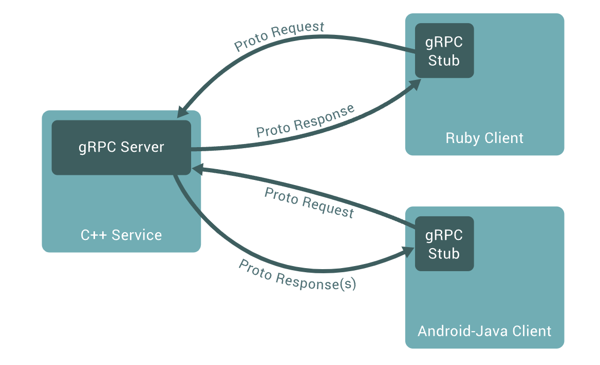 gRPC 는 다른 RPC 들과 같이 서비스를 정의하는 것과 원격으로 호출할 수 있는 함수들과 함수의 매개변수, 반환타입 등을 지정하는 것을 기반으로 한다. 서버측에서는 해당 인터페이스를 구현하고 gRPC 서버를 실행하여 클라이언트의 요청을 처리한다. 클라이언트측은 서버와 같은 기능을 제공하는 stub, 스텁을 가지고 통신을 수행한다.