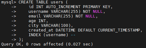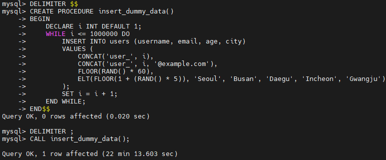 예제 테이블 users 를 생성하고 더미 데이터 100만건을 INSERT 했다. users 테이블의 컬럼 중에는 username 에만 INDEX 를 적용했다.