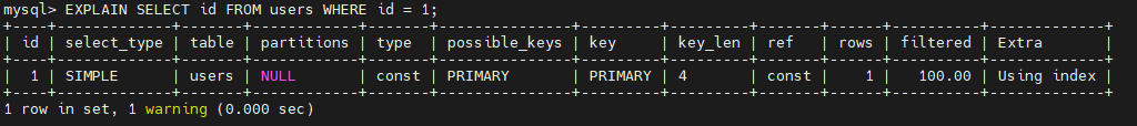 EXPLAIN SELECT id FROM users WHERE id = 1;