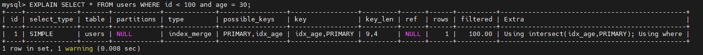 EXPLAIN SELECT * FROM users WHERE id < 100 and age = 30;