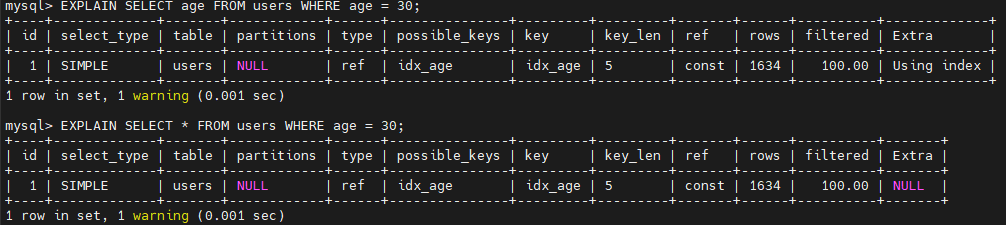 반면에 차이점은 Extra 의 값인데, age 컬럼만 조회한 쿼리는 커버링 인덱스를 충족하기 때문에 Using index 가 출력된다.