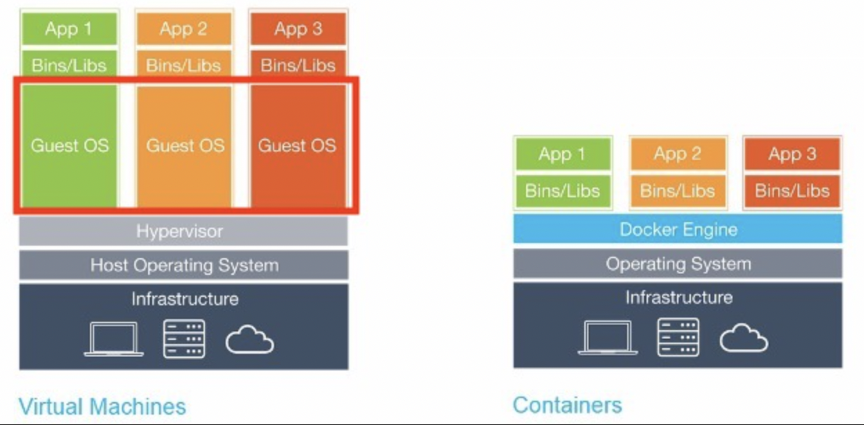 하이레벨에서는 컨테이너와 VM 은 유사해보인다. 둘 다 다양한 IT 컴포넌트들을 패키징한 연산 환경이자 다른 시스템과 격리되어 실행된다. 이 둘의 차이는 게스트 OS 의 존재 유무에 따른 확장성과 이식성, 자원 효율성 등에 있다.