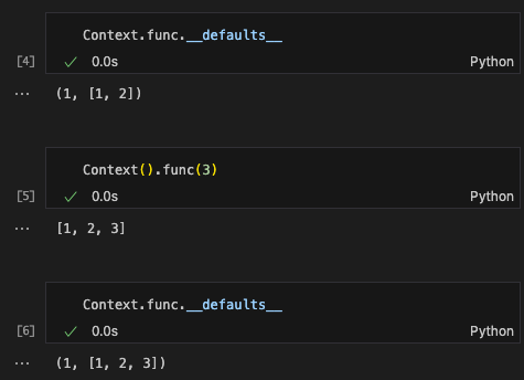 예시에서는 Context 클래스의 func 함수를 호출하고 있다. func 함수는 v 라는 파라미터와 l 이라는 파라미터를 가지고 있다. 여기서 v 는 int 1 을 기본값으로 l 는 list [] 를 기본값으로 가지고 있다.