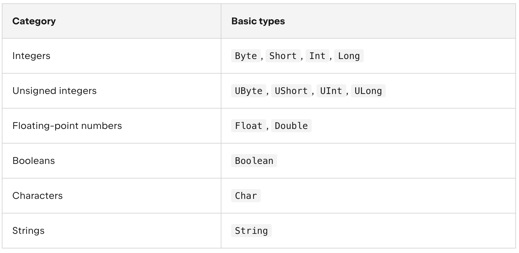 코틀린의 데이터 타입은 위의 표와 같다. 만약 변수의 타입을 선언하기 원한다면 아래 예제와 같이 변수 선언 시에 ':' 기호와 함께 타입을 선언해주면 된다.