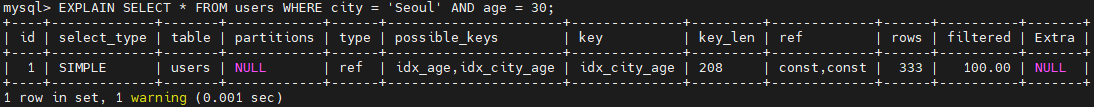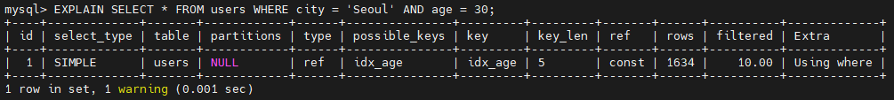 age 에만 인덱스가 적용되어 있기 때문에 possible_keys 와 key 에서는 idx_age 만 출력되는 것을 확인할 수 있다. 그리고 WHERE 절의 조건이 idx_age 인덱스만으로 조회할 수 없고 city 에 대한 조회도 필요하기 때문에 Extra 에서는 Using where 이 출력되는 것을 확인할 수 있다.