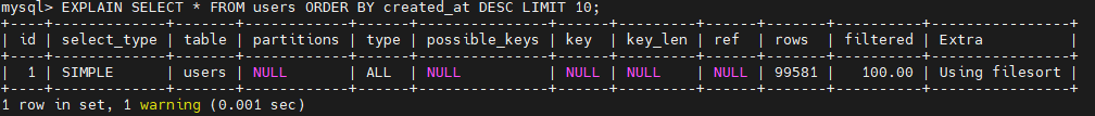 인덱스 조건이 없기 때문에 type 은 테이블 풀 스캔, ALL 이고 possible_keys, key 도 NULL 값을 출력했다. LIMIT 10 조건이 있지만 정렬을 위해서는 모든 데이터를 조회해야 하기 때문에 rows 도 10만건에 가까이 출력됐다. 그리고 Extra 를 보면 Using filesort 라는 값이 출력됐는데, 이 값은 정렬을 위해 메모리에 데이터를 로드하고 정렬 알고리즘을 적용했다는 의미이다.