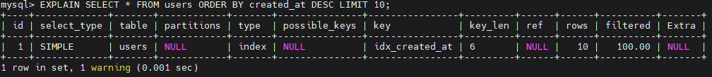 정렬용 인덱스를 추가한 후 쿼리를 실행한 결과이다. 인덱스가 적용되었기 때문에 type 은 index, key 는 idx_created_at 을 출력했다. 반면에 possible_keys 에는 idx_created_at 인덱스가 출력되지 않았는데, 이는 optimizer 가 쿼리 최적화를 위해 사용할 인덱스를 찾지 못했기 때문이다. optimizer 는 WHERE 절이나 JOIN 등에 사용하여 쿼리 조회 성능을 향상시킬 수 있는 인덱스 후보군을 찾아서 출력시키는데, 이 쿼리에서는 조회 조건절이 없기 때문에 NULL 이 출력되었다.