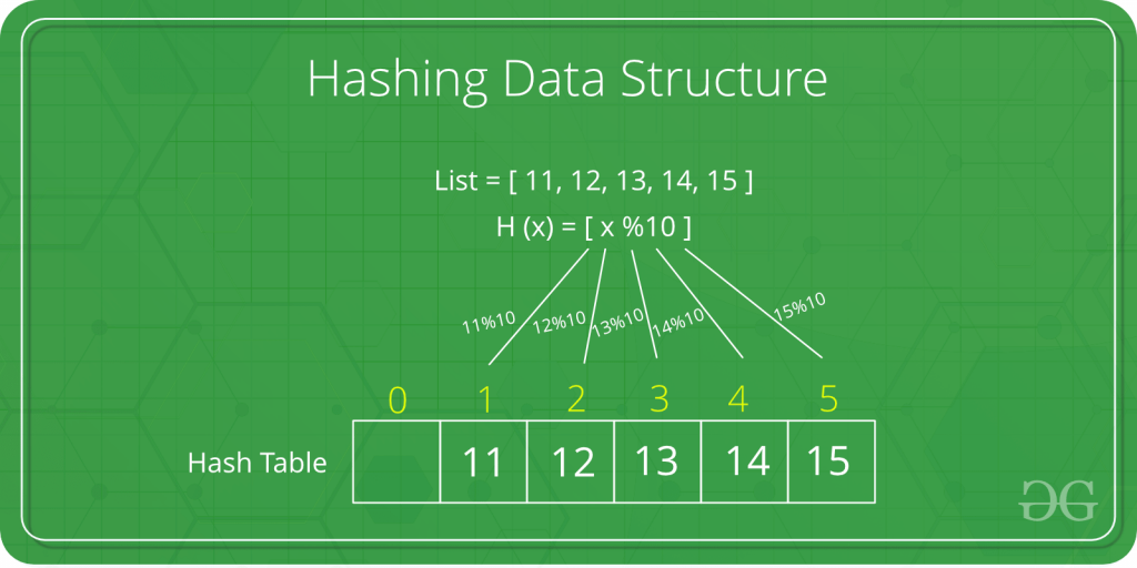 다음 예제는 hash table의 크기가 6이고 hash function이 'H(x) = x % 10' 인 경우의 hashing 구조이다. 리스트에 들어있는 11부터 15의 값들은 각각 hash function H(x)를 거쳐서 계산된 key 값을 인덱스로 hash table에 저장된다.